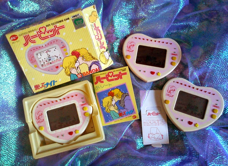 Da ragazzina ho adorato alla follia questo anime e oggi sono fiera di aver conservato con cura tutti questi pezzi. Chi non ricorda il fantastico giochino che Andrea usava in alcuni episodi? Tempo fa ho trovato questo game watch senza scatola ed istruzioni, ho inserito una batteria e ho cominciato a giocare, come tutti i game watch anni '80 il giochino è grazioso ed intuitivo ma anche monotono e ripetitivo tuttavia non sono riuscita a capire la funzione di tutti quei tastini rossi in alto fino a quando ho acquistato una versione quasi nuova del giochino con scatola, stander ed istruzioni. I 2 giochi molto vecchi, nella foto sulla destra, hanno la plastica ingiallita mentre quello nella scatola è ancora bianco latte, botta di culo! Nelle istruzioni viene spiegato come giocare con le affinità di coppia inserendo il gruppo sanguigno di lui e lei e le date di nascita, in Giappone chiedere il gruppo sanguigno a qualcuno è un pò come chiedere il segno zodiacale, insomma per farvela breve si inseriscono i dati richiesti grazie ai tastini rossi & co. e parte la percentuale di affinità.