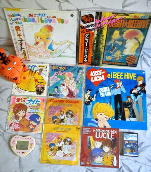 Potevano mancare i vinili originali? NooOOOooooo, e difatti ecco qui i 33 giri dei Bee Hive in giapponese e i singoli su 45 giri compreso il brano che Andrea dedica a Giuliano. Vediamo anche il 33 giri italiano e la musicassetta italiana con tutti i pezzi dei Bee Hive, materiale che ho conservato gelosamente da quando ero piccola. Il 45 giri rosso con la cover farlocca è francese, qui la base musicale è identica a quella italiana ma al posto di Cristina D'avena la sigla in francese è cantata da Claude Lombard. Il 45 giri italiano con la sigla di Cristina D'Avena fu un regalo per mia sorella quando la andai a trovare in ospedale dopo l'intervento alle tonsille, avevamo 9 anni e quel 45 giri è ancora lì. Il lato B del 45 giri ha su la sigla di BIM BUM BAM con Manuela, Bonolis e Uan successivamente, in seguito all'enorme richiesta, venne ristampato un altro 45 giri con la sigla cantata sul lato A e la versione strumentale sul lato B, potevo farmela mancare? Certo che no.